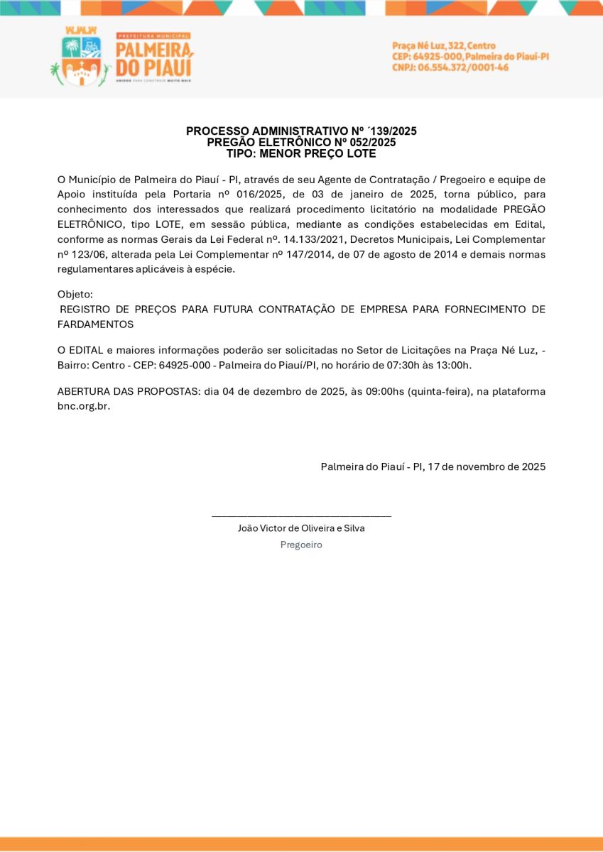 AVISO DE PREGÃO ELETRÔNICO N° 052/2025