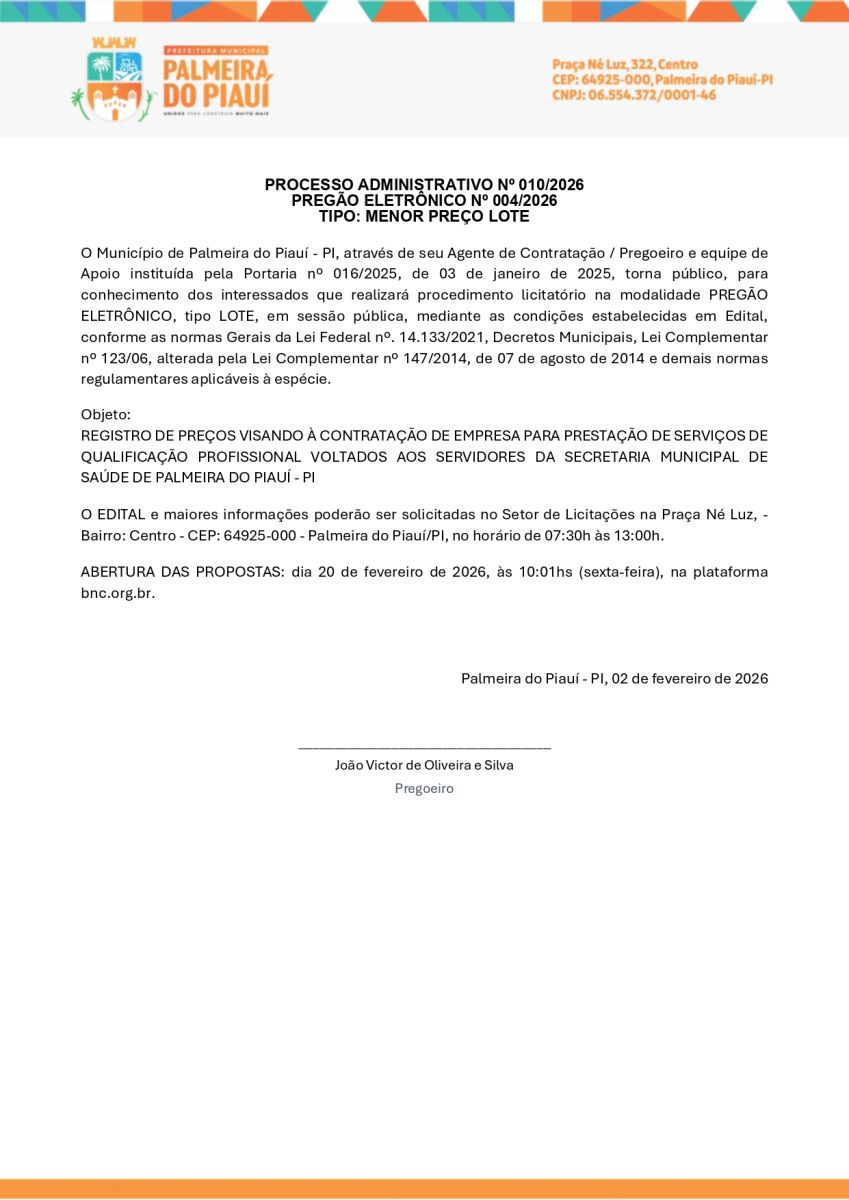 AVISO DE PREGÃO ELETRÔNICO Nº 004/2026